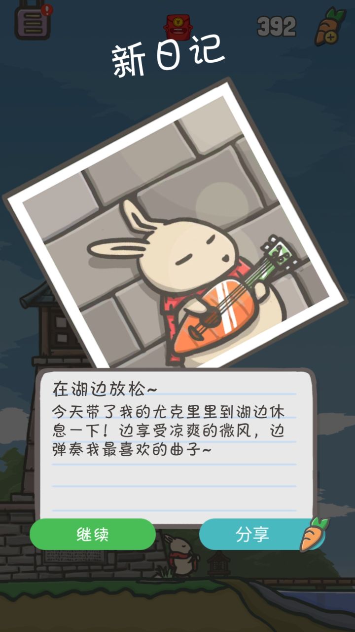 去湖边钓鱼的时候琪琪想听兔兔弹尤克里里,然后触发了下面这个日记,BGM居然变了!在原本的BGM中加了尤克里里弹奏的树屋的BGM!我太爱这个游戏了