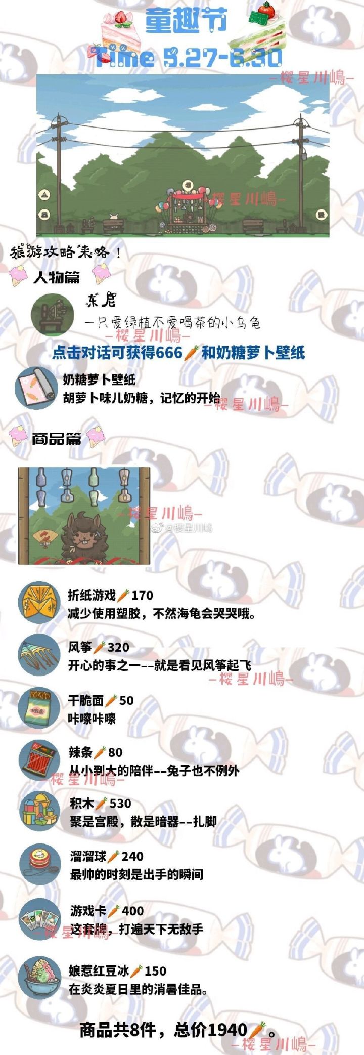 [国服2.0.41]①国服【6月限定】节日②特定活动节日均【无日记】③商铺售卖品价格💰折纸游戏→170🥕风筝→320🥕干脆面→50🥕辣条→80🥕积木→530🥕溜溜球→240🥕游戏卡→400🥕娘惹红豆冰→150🥕共8件商品,总价1940🥕④点击与【东尼】对话:获得666🥕和奶糖萝卜壁纸