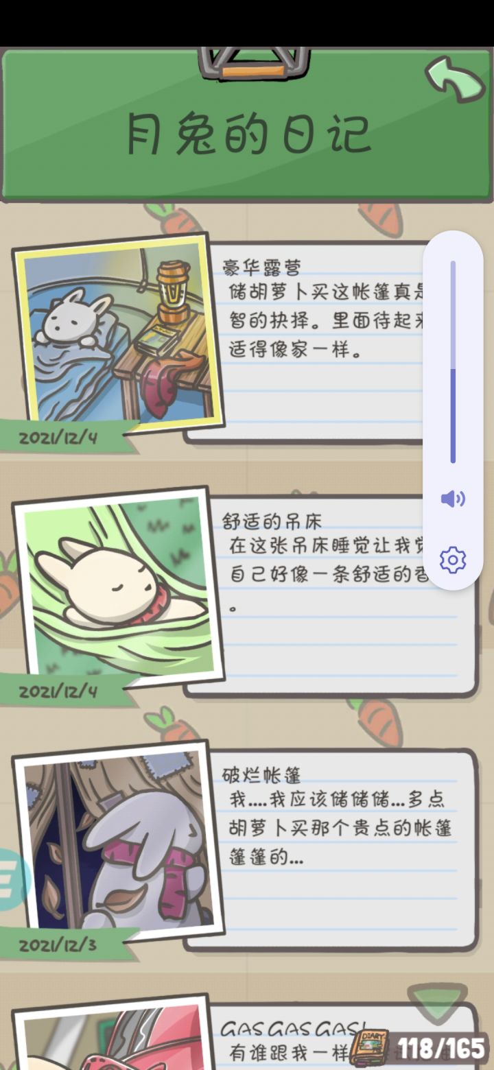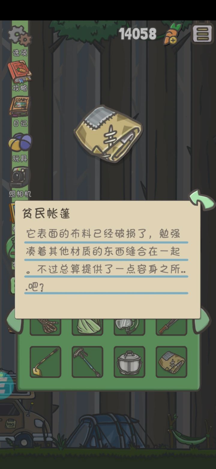 好奇怪啊,我的胡萝卜最近一直停在1小时59分不动,没办法收胡萝卜,后面出去森林一整天了也没有收到胡萝卜信封;还有我买的贫民帐篷,没有买豪华帐篷,忽然就有了,看背包也没有(胡萝卜也没少),莫名其妙😂