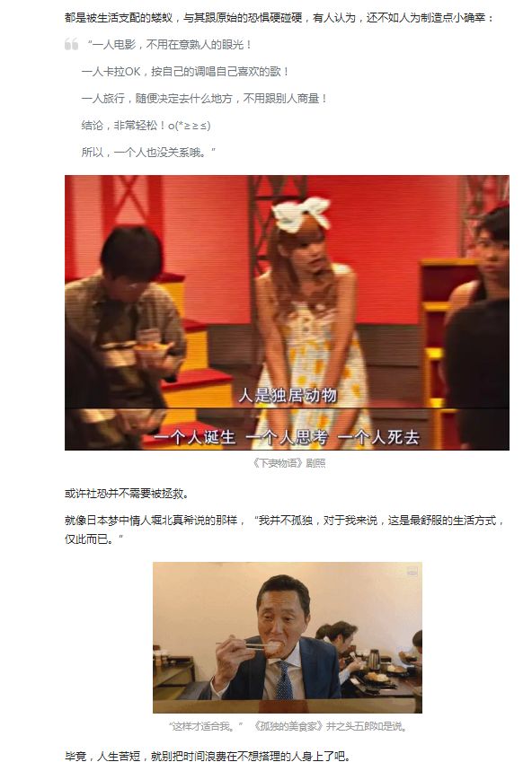 一个人的电影,想哭就哭,想笑就笑一个人的卡拉OK,唱自己喜欢的歌,走自己喜欢的调一个人的旅行,看自己喜欢的美景 ,吃自己想吃的美食一个人也可以很开心哦!图片引自:https://www.bilibili.com/read/cv7950009?from=1001