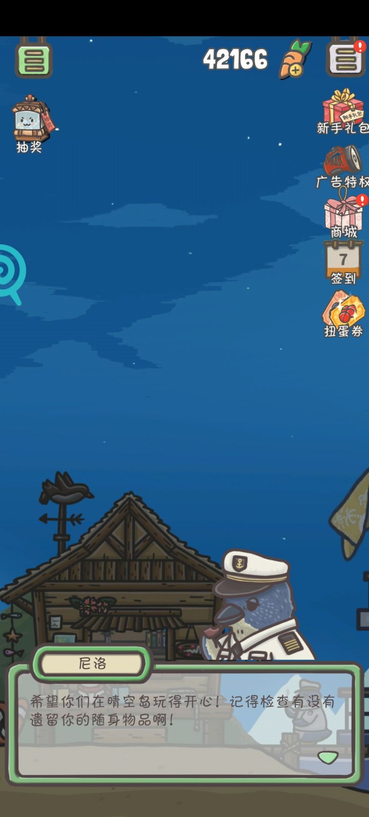 今天半夜上线想钓鱼 结果发现兔兔已经在打包东西收拾回家了 其他地方去不了 周五凌晨去的晴空岛 周一凌晨会自己回来 所以 在晴空岛的日子才三天吗????!
