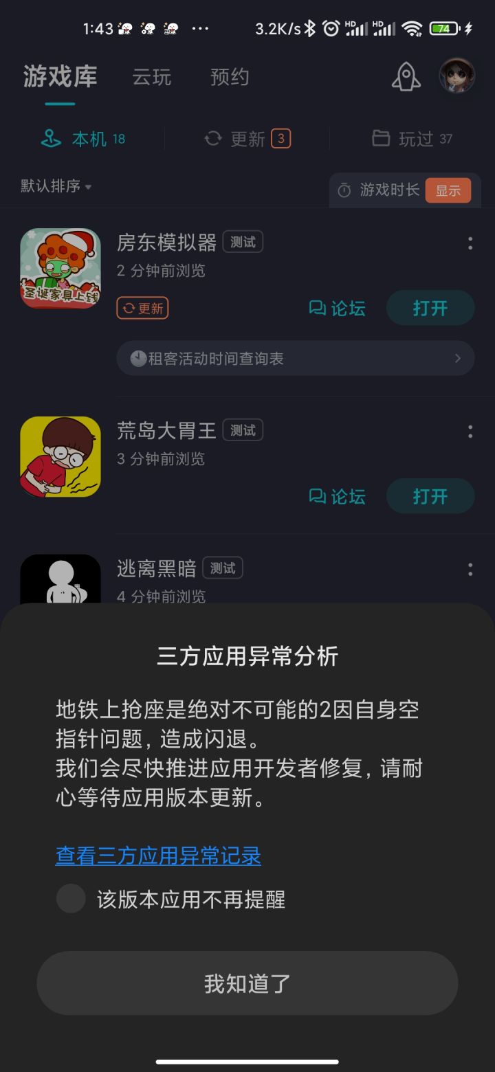 空指针异常,闪退频繁,这个问题开发出来自测的时候应该很容易发现的啊,实在不行做个try catch跳过能继续运行也好啊,游戏体验不佳