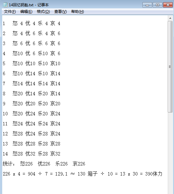 从0拉到14回忆 要130箱子 大概390体力 (最低)后面有机会在做缘轨和升级要的体力