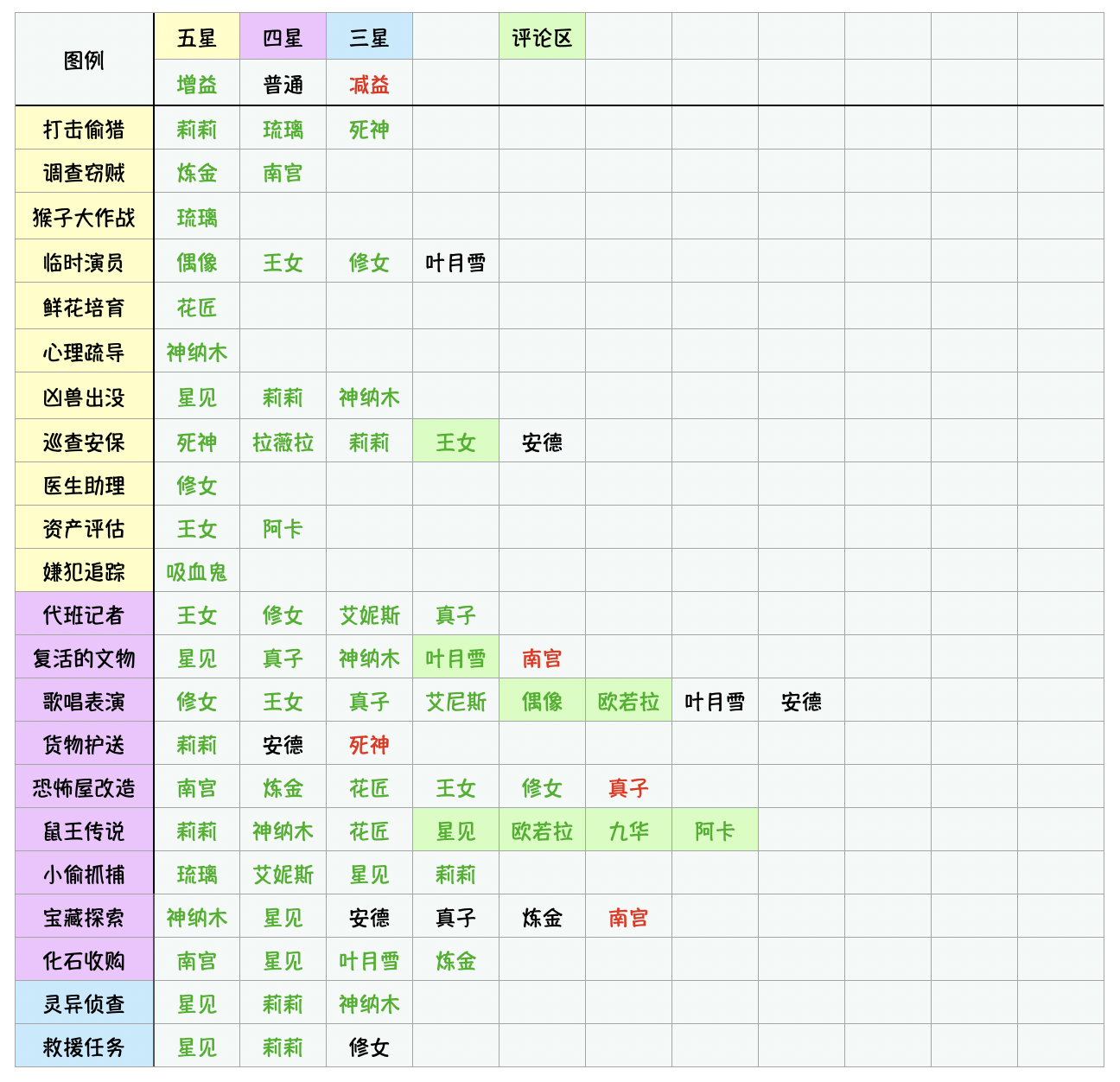 9.20更新9.14更新添加了普通人偶,以黑字标识,对事务无明显影响9.13更新鉴于五星任务推荐人偶出现减益记录,改为两条以上红字标记,增益–减益≥2绿字标记之前Tap里收藏了一个事务所的帖子,可惜现在没了,只好自己开个新的摸鱼人可能更新比较慢_(:зゝ∠)_帖子主要记录4-5星任务,记录里无红字且出现三次以上绿字记为增益,出现红字记为减益(996疲劳除外)推荐人偶升到五星均会显示
