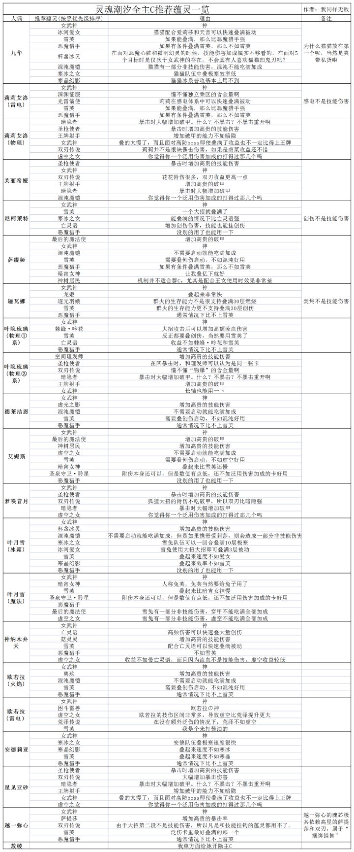 特别说明:1.因为我不清楚紫色蕴灵收益,所以紫色蕴灵不在讨论范围2.本表有部分非同乘区蕴灵并未严格验证过收益,相关内容仅供参考。如有错误欢迎指出3.请不要以XX人偶使用A蕴灵比B蕴灵好得出A蕴灵比B蕴灵好这个结论4.本贴推荐优先级均以满配为准,不满配优先级可能与本帖不相符7.16更新内容:1.修改了欧若拉【荒泽传说】【困斗雷兽】【虚空之女】优先级2.新增【虚光之影】蕴灵推荐3.修改了