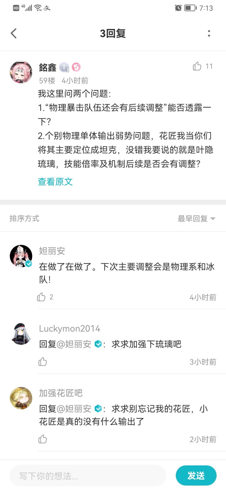 偶尔间翻看评论,发现大脸说下次会继续调整物理和冰队,这我一听,好家伙,这不直接起飞?但是你*你为什么要说加强琉璃和花匠呢??就把星舰暴击队说成物爆队,然后琉璃说成物理队,你物爆队好不容易调整一下威力从1加成了2,物理队还是1,你这说加强琉璃?你想咋?平衡物理这俩队的强度吗?有这么个机会你不继续加强物爆队让它从威力2变成4,这不亏死吗?天见犹怜,气死。🙃