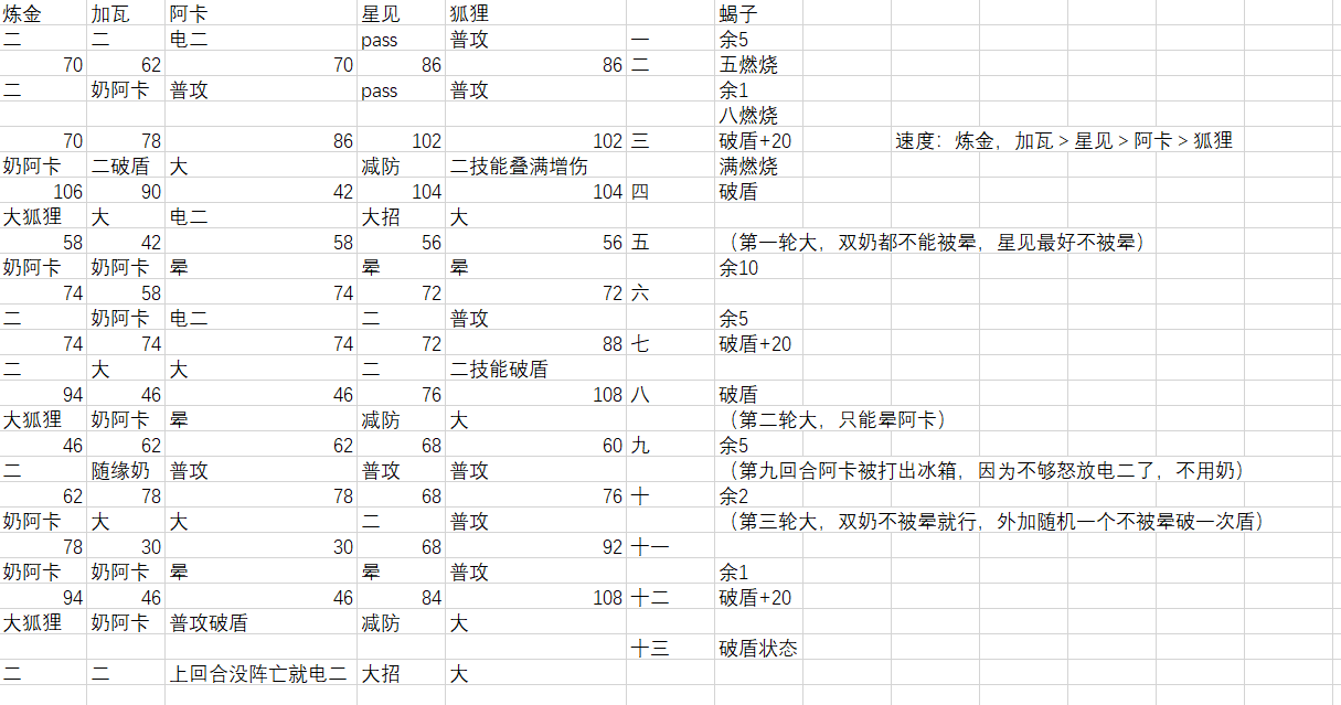 上周我蝎子是用雪兔主c打到了蝎子第19层(第16名),所以对蝎子也还算有点理解,这次脑测一下不喜勿喷,有错误欢迎指出总共打13回合,狐狸可以放四次大,一次二技能叠满40%增伤狐狸主c的话,打蝎子的节奏应该是和雪兔主c差不多的,这里算了极限被晕的情况(最多只能晕这么多,晕多了要sl)诅咒人偶就不用想了,没火弱点,所以异象狐狸主c只能打蝎子想玩玩的可以开始练了