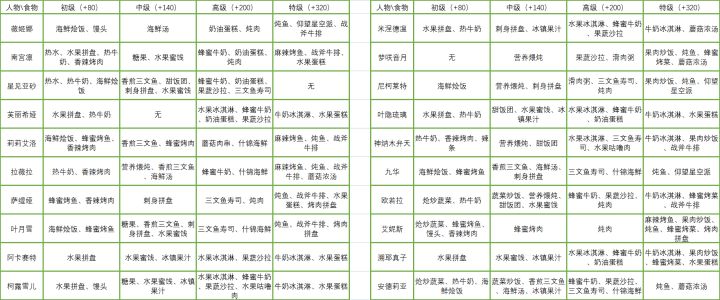 wiki上有测试时的赠礼数据,但是本人看不懂,所以自己做了一个(本人没有的人偶用灰色填充)祝各位的老婆尽早满好感度8/27本人对数据进行了一点点简化,仅留下了对应角色喜欢的食物,增加了萨缇娅、阿卡赛特、叶隐琉璃、九华的初级食物数据。8/28补充了部分遗漏数据,补充了部分非喜好但好感增长较多的食物,增加了拉薇拉、尼柯莱特的初级赠礼数据。8/29补充了萨缇娅、阿卡赛特、叶隐琉璃、九华、拉薇拉
