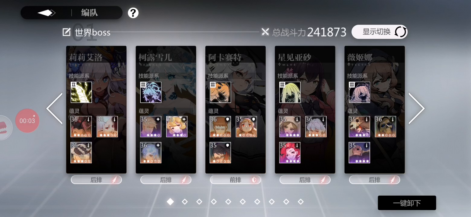 早知道升莉莉了,之前一直主星见,现在星见玩第二套给莉莉打辅助了……这俩5万还不如莉莉一个人6.5万………升星见的深渊全给莉莉,莉莉差不多五星了………难受啊!(目前莉莉3000攻左右)。