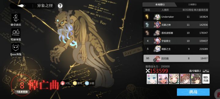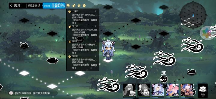 同样核心是药,这边等级只比图一普遍高一级,还是吃的紫色的饭,唯一需要注意的是别开自动,不要带死神群伤或九天雷大(不做过多解释,打单怪用反击奶和群伤技能确实有点可爱了。。。。)者不要想着无脑刷过去。就拿我森林关举例,boss四个动作一重复。一次开盾,二次不动用原来的盾,三次起床愤怒预警,四次开大后加盾。那么我们的要点就无非是保证前排血量和破盾时机。如果实在觉得困难后面我会进行补充。