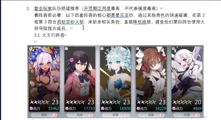 本内容来自b站miku大酱的视频,看完后觉得他的最中肯,本来也试验了,这么配立马过关了(游戏最主要的就是破盾,破盾之后加怒气伤害加倍,大招带走)第一个阵容是大氪金玩家阵容,不要说为什么没t,因为都氪金拉满了,没必要用t了(个人没试过这个还是喜欢有t的)接着就是标准1前排4后排阵容五行缺火阵容五行弱魔阵容(本人用的这个,抽到阿卡和雪儿后,接着首充6元,第一天直接通关3-6,19级了,4-1要