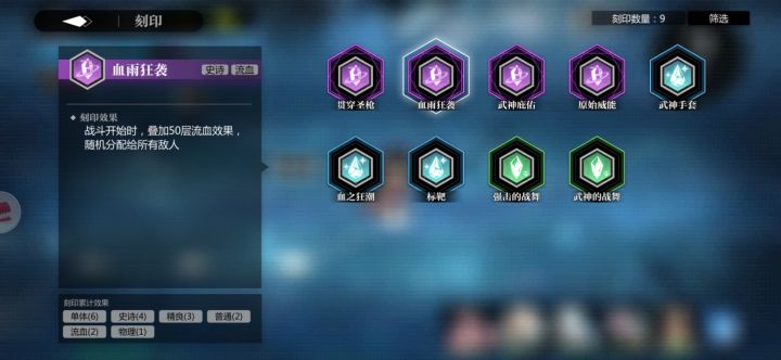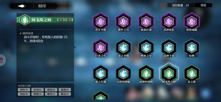 刻印有,单体,爆发,暴击,甚至有史诗,精良等等之分,仔细观察会发现每一个词条包括史诗都是有加成的通常2个同类型的就会有加成