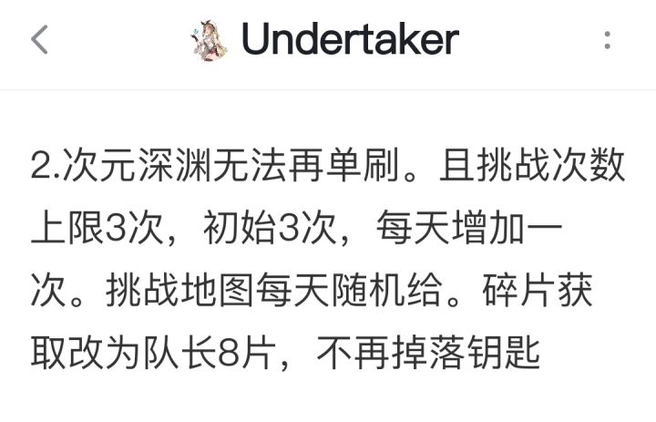 次元深渊非常看重队伍战力的平衡。我抽卡很非,保底了一次,并且四次抽到同一张卡,所以那个角色的战力起码高了6000,结果进了深渊,一个怪让我死一个角色,死剩三个时就打不过了。后来我重练了一些角色,把战力控制在1w一下,并且相差:不到500,进了深渊,直接自动普攻,练打两怪半血,智能时一个群疗拉满。