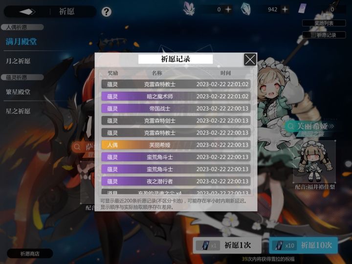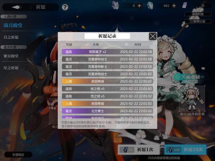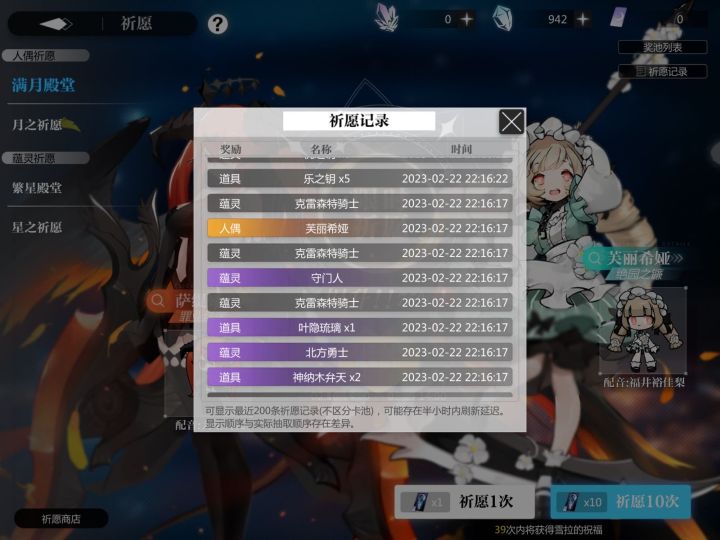 bug:1.新人偶多洛莉丝的鸣响判定比较奇怪,对于某些鸣响技能并不会生效。可生效的:破灭的欲望第二段(芙丽希娅)灭国棘火、失心童话(欧若拉,其中失心童话的雷追加连技能都不是,但也会被不尽鸣响重复)无懈境界(艾尼斯)聚雷之剑(德莱洁恩)液态炎爆第二段(伊汐尔)炎落死苦(越一弥心)除灵追魂箭(神纳木弁天)乐园演出(叶月雪)部分失效的:绝对零度(第一段丢失,柯露雪儿,pass: