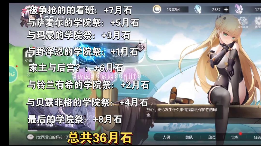 不知道每个人是不是不一样,我的是: 家主与后宫6 被争抢的看板7 最后的学院祭8 老师1 萨麦尔5 玛蒙3 贝菲露格4 有希2 总计36#灵魂潮汐