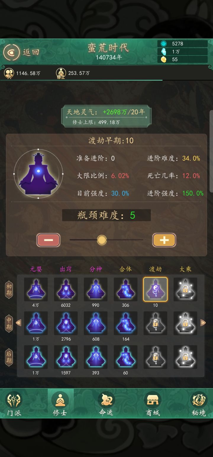 小弟都渡劫了,咋还是蛮荒时代,不让进阶时代啊??其实没必要故意卡时代,延长游戏寿命,不行就设计一个阙值,多少某个境界的修士、位面面积、灵气浓度等达到阙值可以达到下一个时代,,,,,,萌新的亿点小建议(小声bb:不行我自己做一个游戏,反正现在不会编程也能做游戏)
