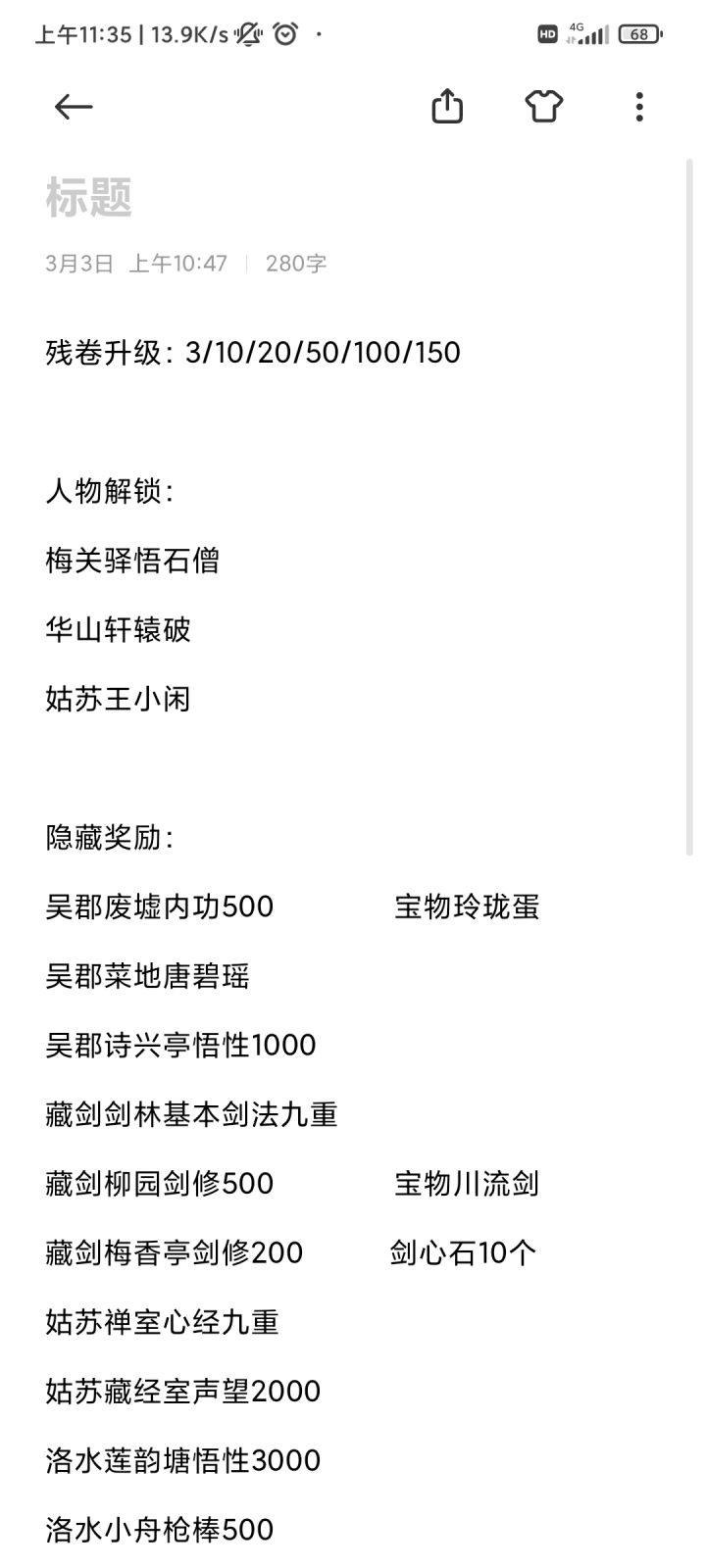 零氪新人最优开局,挂机江州驿第一个剧情怪,挂出同归剑法两本先不学(学了之后残章掉落清单等于多了一个,据说不利于掉整本秘籍,同归剑法是蓝色秘籍每次分解是三十残章),多余的同归剑法都分解成残章待用,一直挂够两人能够修至七重的残章,2*83=166个。同归剑法七重效果消耗50%血量换取同等伤害。这样猪脚和明月七重的同归剑法基本能保证输出,剩下的就是堆血,满足命中和破招。三重突破需三残章四重突破需十残