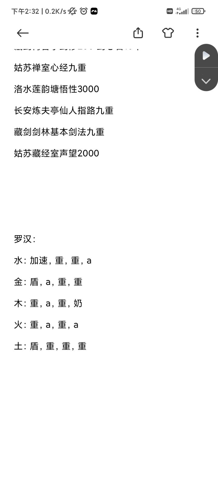 藏武攻略一、这个游戏玩啥本游戏属于单机武侠养成游戏,通过不断练功、打怪通关剧情是本游戏的目的,游戏周期长节奏慢。二、如何开局因为是单机游戏,所以可以刷开局,刷什么,刷商城,每天有1次免费刷新机会,通过删档可以重置,等于无限免费刷新商城。主要刷2种武功,一个是非氪金的刷同归剑法,这个剑法是通过掉自身血造成额外真实伤害,是前期非常好用的逃课玩法,二是氪金玩家刷天音琴诀,这个被动效果是进场增加聚