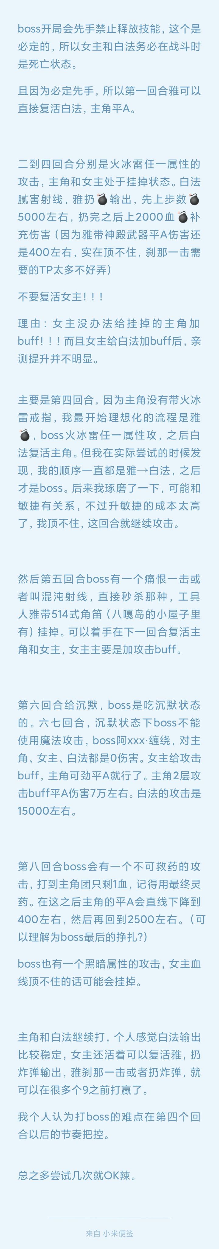 我写的比较细节。。。我打的时候是第三周目。主角99级血8500左右,带两次行动卷轴和腻害指环。女主5900左右,带力量指环和火冰雷戒指。白毛4500左右,带两次行动卷轴和火冰雷戒指。雅是5800左右,带514式角笛和火冰雷戒指。主角血量越高,前几下没有buff的平A伤害越稳定,加两层buff之后一下平A9000+血。