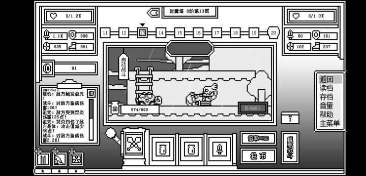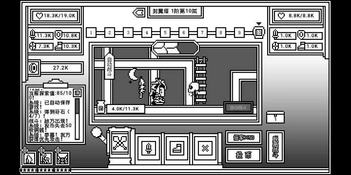 封魔塔?封魔塔是什么,我的钱全部拿去赌大小去了。没钱了就去问石俑要,石俑也没钱就去钓鱼,然后把钱全部花到赌场去了,根本没钱去封魔塔。彻底活成了赌狗的样子,封魔塔有什么意思嘛(迫真)。这游戏感觉还是不错的,就是一直爬塔不知道是要干什么,如果以后多出一些剧情,多增加一些互动性就好了。加油,希望做得更好,越来越好!
