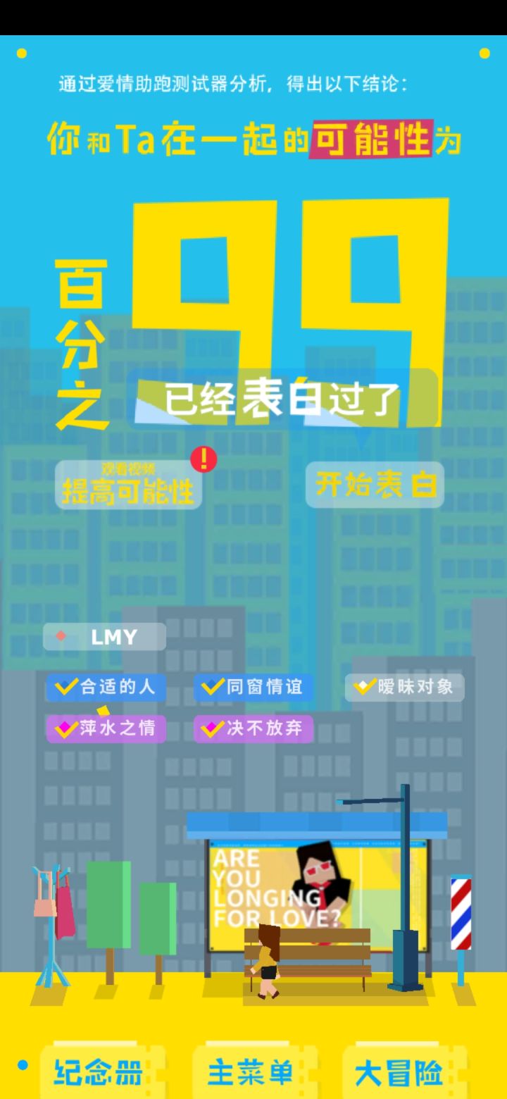 看了一个广告,变成99,结果就无法表白了,好不容易有一个能看真结局的人,你给我搞这出,限你一个月之内改完这个bug,不然杀了你哦
