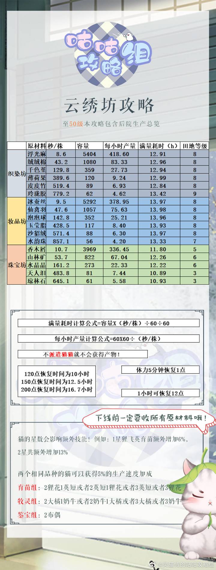 这里是咕了很久的贩卖攻略💖但!这次带来了全新版本!(此次攻略需要本文案全文观看)掌柜咕咕为您带来全新的【云绣坊贩卖】攻略6.0目前等级:50级云绣坊❗ 图1是原材料生产速度,图2是商品价格及贩卖方案,图3是利润表(也可以说是性价比表)❗ 图2➗ 105➗ 4是因为焕肤面膜和狸儿诱需要105冰蝉丝,焕肤面膜需要4种原材料❗ 关于图3的算法解释经过多次测试满量耗时都在10h上下,所以成