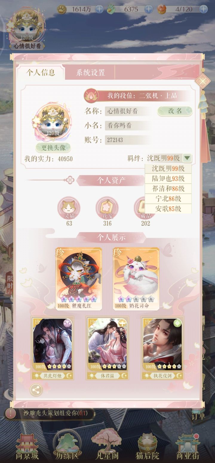 安卓区换手机出号51珍卡 仙人侯爷祁公子加所有限定卡全 13珍猫 有蛮蛮和神女 all推 差个两三张 开服玩到现在 中氪有永久卡 好感度都是85左右 白玉糍100多 同心结750多没咋用 喵贝200多万 光猫的战力41万多推啥都够 除了累充活动头像背景都齐 周年庆全 侯爷三星有预算的铁子带价来询 很好说话不装逼 已婚妇女不是很懂可爱的语气词