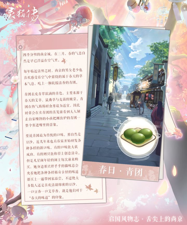 青团作为清明节的传统美食,也是春日限定的时令甜点。咬下一口热韧的青团,就好像品尝到了柔软的春天。而商铺间一个个蒸笼升起带着艾草香气的白烟,也是尚京春日里一道生动的风景线。青团除了受到尚京男女老少的喜爱,似乎也深受某只胖乎乎的小猫咪的欢迎。小阁主的家乡在春季吃青团吗?————往期回顾————第一期:第二期:第三期:第四期:第五期:第六期:第七期:第八期:第九期:第十期:第十