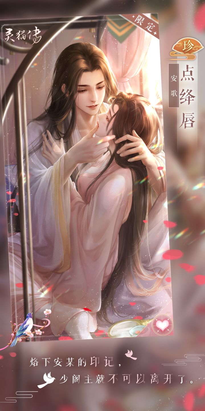 为女子描眉点唇,有传情之意。从前他并无心悦者,如今遇到你,便只想为你做这些。“那少阁主,想要什么呢?”❤卡面属性:感知❤获取方式:「花月遇良人」系列寻访中获得,详细说明请查阅游戏内公告。————————♥大小姐们都在这♥官网:https://cat.dailygn.com/?from_source=tap官方微博:@灵猫传B站官方账号:灵猫传抖音官方账号:灵猫传和TA的铲屎官们