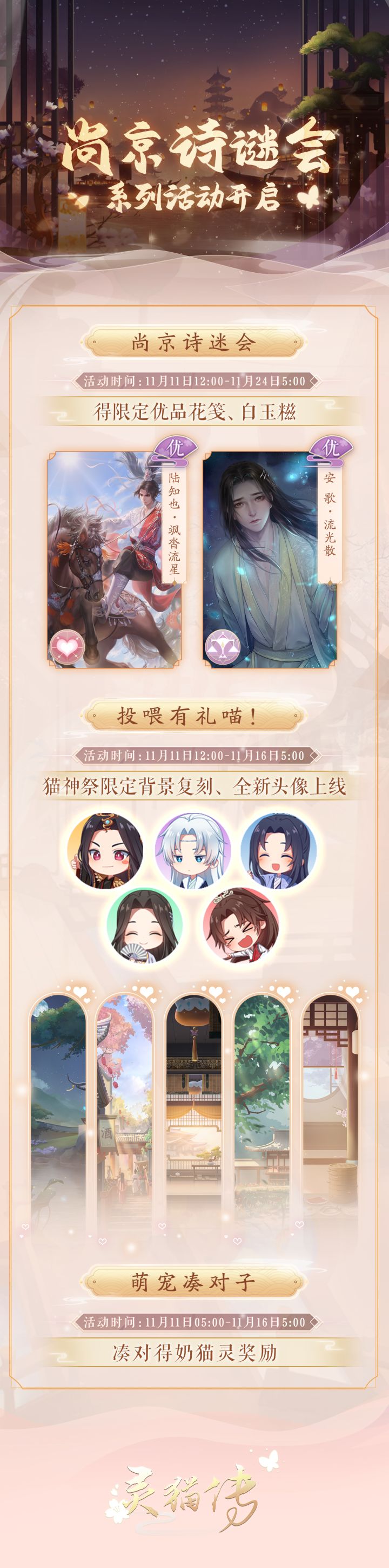 【尚京诗谜会】✨活动时间:11月11日12:00-11月24日5:00❤️活动期间,小阁主每日登录、每日消耗300体力总共可领取【猜谜券*2、紫光玉*40、金光玉*50】,猜谜券可用于在进行1轮猜谜。每轮猜谜共10题,每次参与答题,将根据答对题数获得对应数量的【彩灯】。❤️使用【彩灯】,可在喵老板的小店中兑换全新优品花笺【陆知也·飒沓流星】、【安歌·流光散】及光影卡、白玉糍等好礼。注:-