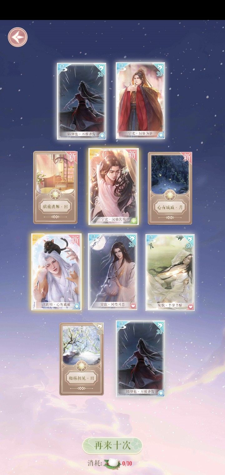 立绘是五位男主中最有特色和新意的,每张卡的颜值也在线。这真的是我目前最喜欢的一个男主了,见证了刚开始触碰他时的冷漠“放开”“去抱思归”,慢慢相处到后来,仙人会开始说“你一靠近,我便能感觉到”,也会和我解释“这具身体不知冷热”。他一直在身后默默看着我,必要时出手相助。
