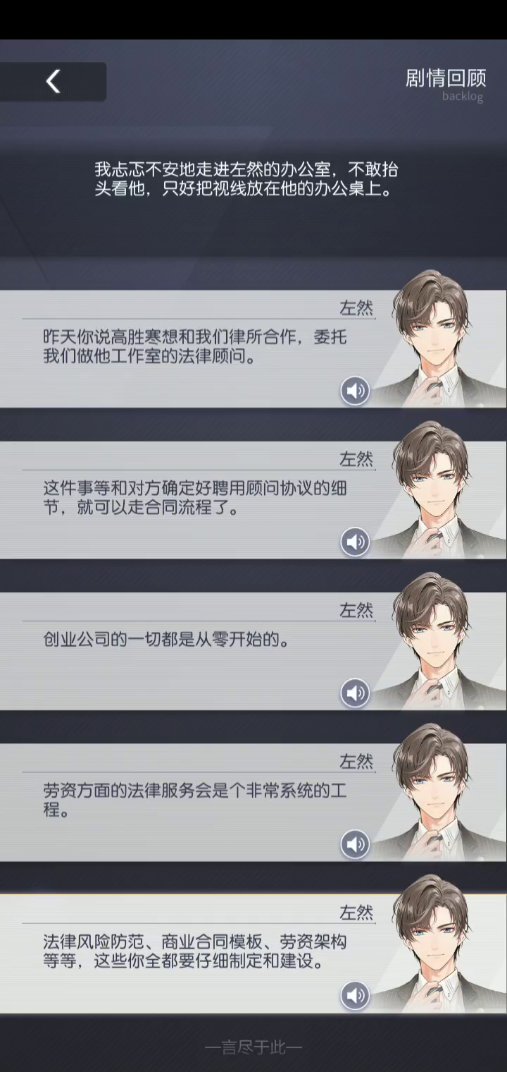 卡牌:醉意入怀 最后一节故事左律这句话:法律风险防范,商业合同模板,劳资架构等等,这些你全都要仔细制定和建设。(和建设没有声音)所以这是bug吗