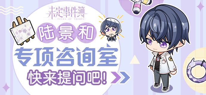 未名市专项咨询室开放啦!诚邀和印集团执行总裁陆景和参与专项咨询室提问环节,陆景和是否可以回答律师们心中的疑问呢?本期互动,参与话题讨论“你想和陆景和专项咨询什么内容?”,快来评论留下律师想向陆陆景和咨询的内容吧~游戏内专项咨询活动已限时开启,完成专项咨询,即可获得丰富奖励,并有机会解锁陆景和限定【初露】MR思绪!详情见活动链接>> ——————————▌★联系我们:官方微博:@ 未定事件
