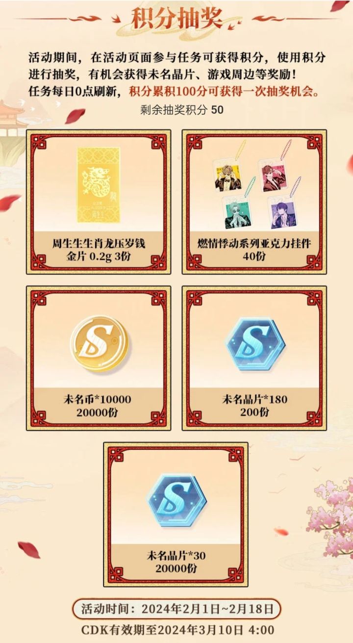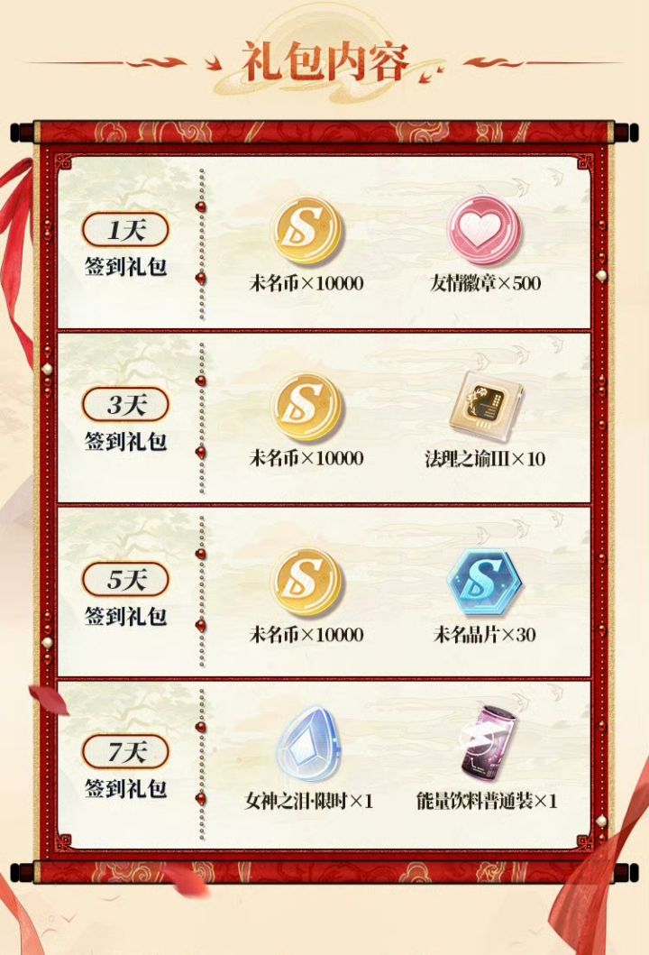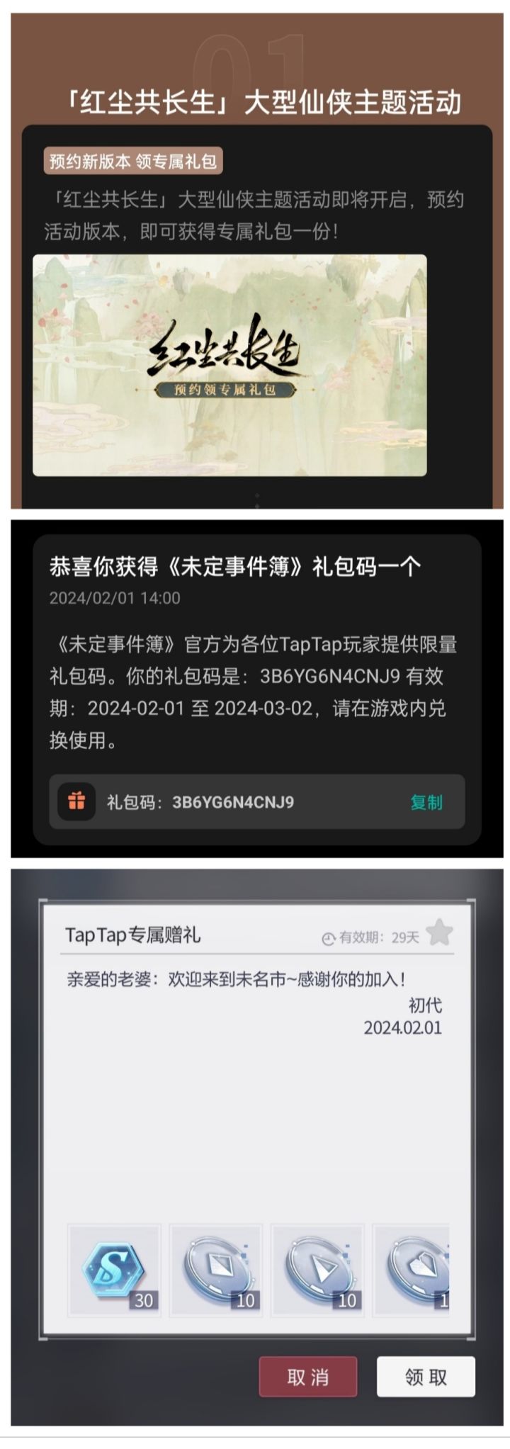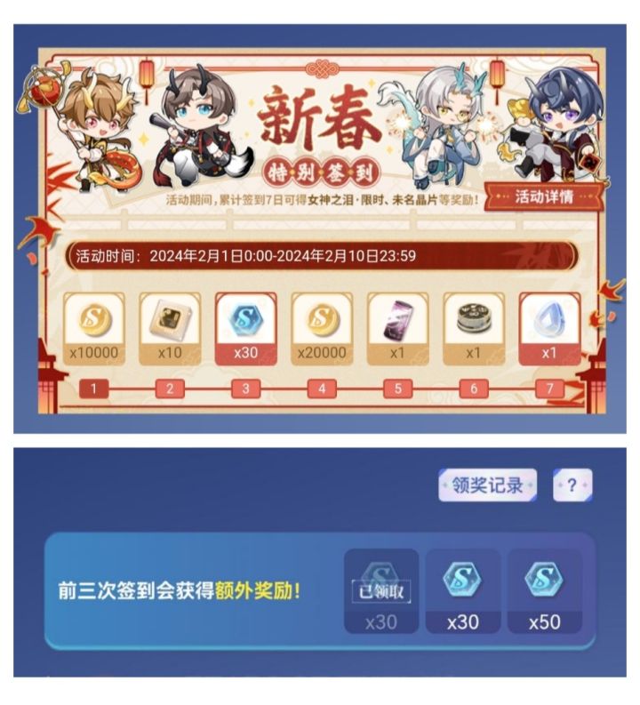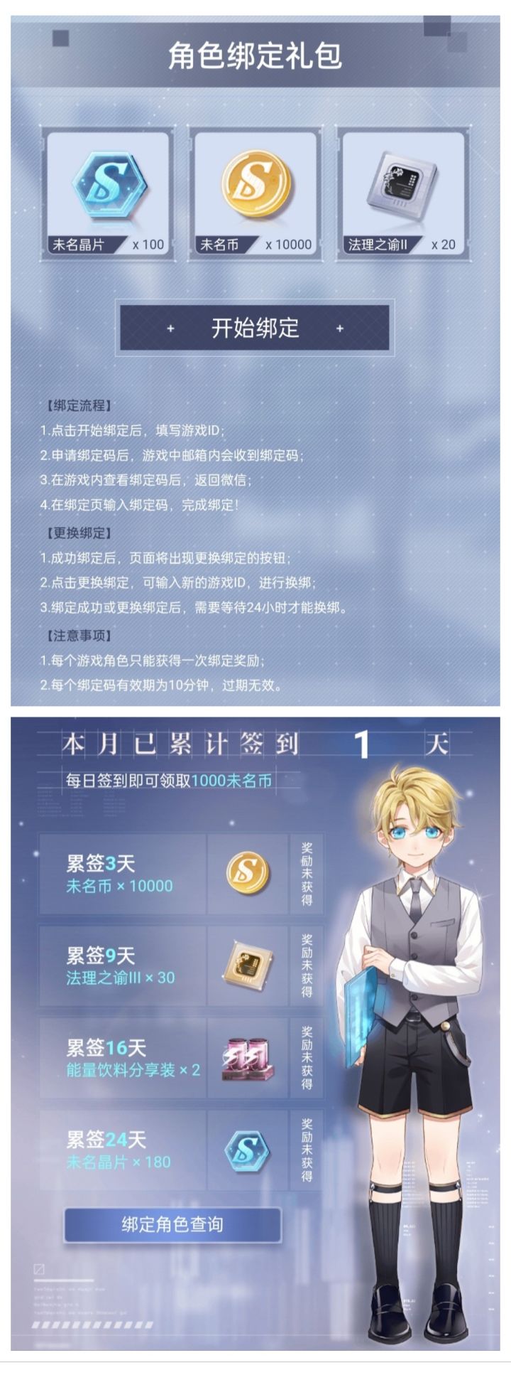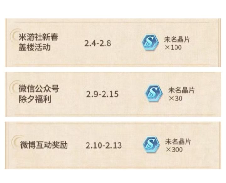 各位律师小姐,前提祝各位新年快乐呀~新的一年心想事成,欧气满满,能一发入魂抽到自推的新年卡图一:回归奖励 2*限时泪(仅限回归玩家可领取)活动时间:2024.1.26~2024.2.19图二:微信公众号《未定事件簿》绑定奖励 100晶片(永久领取,仅限一次)公众号《未定事件簿》每月累计签到24天 180晶片(每月一次)图三:taptap签到 第四天 30晶片 第七天 1*限时