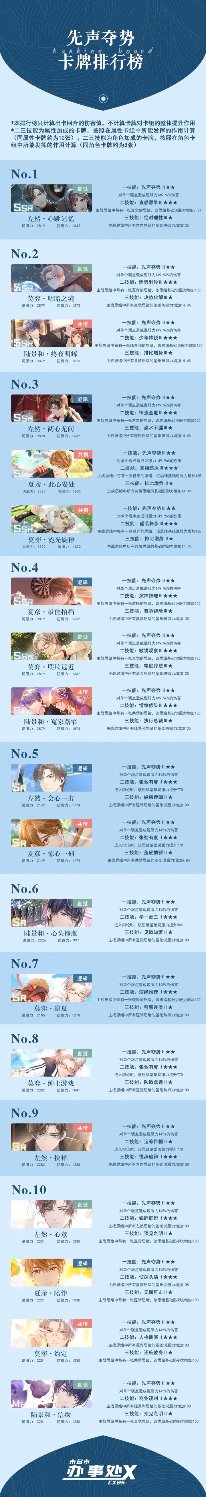 这一版本的思绪推荐排行榜是我们从开服时就一直坚持做到现在的,当时考虑到律师们推主线和异常时,主要会根据关卡属性组建对应的卡组,是基于卡牌在相应属性卡组中所能发挥的作用进行排序的。但近期的多个活动关卡,都弱化了对卡组的属性要求,许多单推律师都是根据角色来组建卡组的,近期的活动卡也大多以角色加成卡为主。因此,最近我们正在基于卡牌对角色卡组的加成作用指定一份新的思绪推荐排行榜,以满足不同律师的诉求,敬请