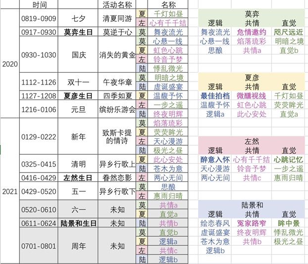 常驻池:8个常驻轮替池:2活动or常驻,每2周一换活动池:两个活动up,之后会进轮替池,一年六个生日池:一个生日卡,两个常驻卡,泪约128,不进轮替池限定池:4限定卡,国庆春节周年(?)限定,四卡概率轮流提升,不进轮替池,使用限定泪和限定泪约轮流概率提升安排如下(春节池)活动周期大概是:限定活动5周*3+普通活动4周*6+生日活动3周*4=51周(一年)一年单人会出3限定3活动1生日