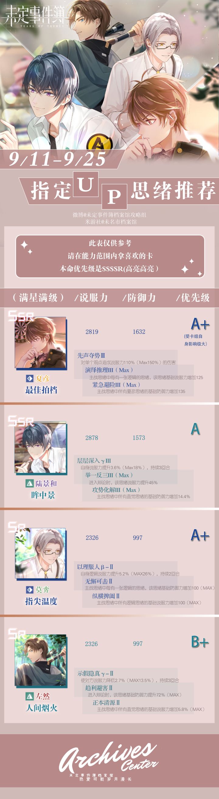 卡牌推荐说明:S+ > S > S- > A+ > A > A -> B+> B> B-同等级排名无先后之分其他说明:▲该榜仅针对思绪本身,与角色无关。▲所有卡牌数值均已实战,并已经过极值计算以保证数值准确。▲推荐以图鉴数据(满星满级,技能满级)为参考对象。▲划重点:喜欢的卡就是最强的卡,此榜仅供参考。