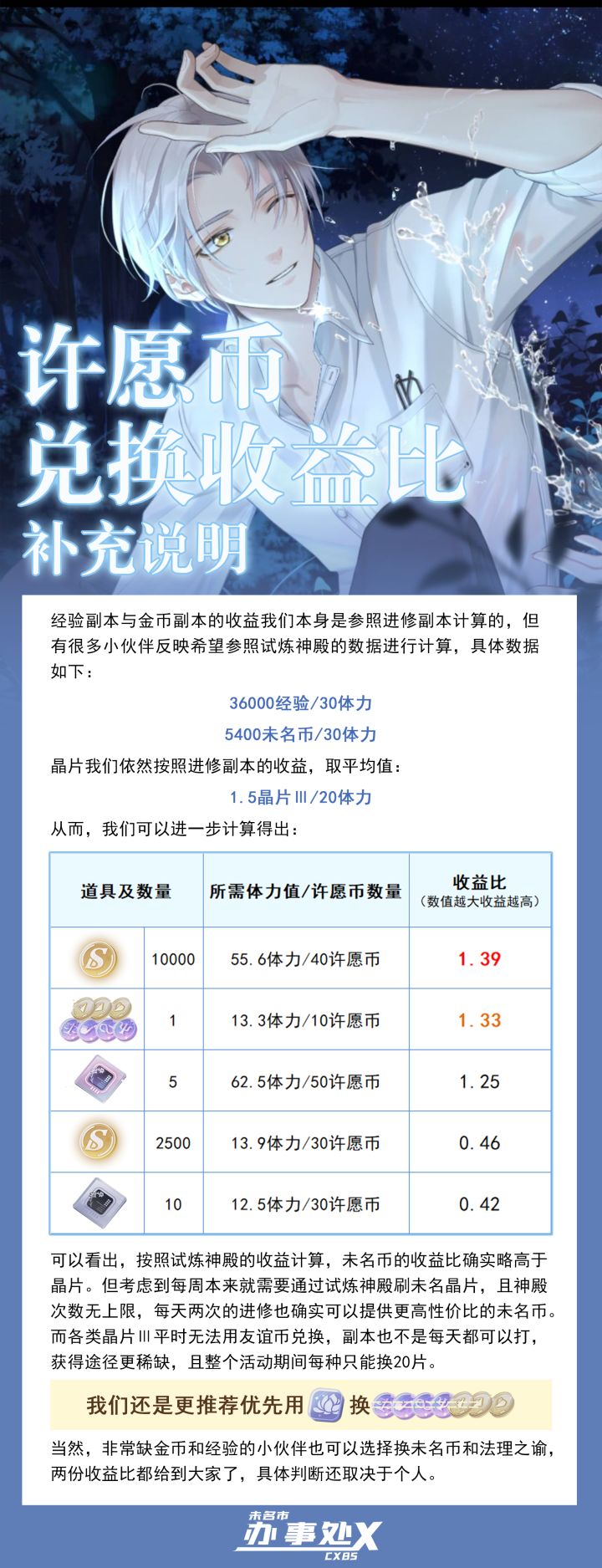 大家好,这里是cxbs,自从cxbs发布【许愿币兑换收益比】攻略之后,陆续收到了来自许多小可爱的诸如“次数限制、与实际需求矛盾”等的疑惑,为此,组内的数据老师重新做了计算,经过反向计算之后,我们仍然从性价比的角度支持将许愿币兑换为晶片(见图)。但是,攻略组只是为各位律师提供建议和辅助作用,具体如何操作,还要看各位律师的主观意愿[爱你][爱你][爱你]原版链接:
