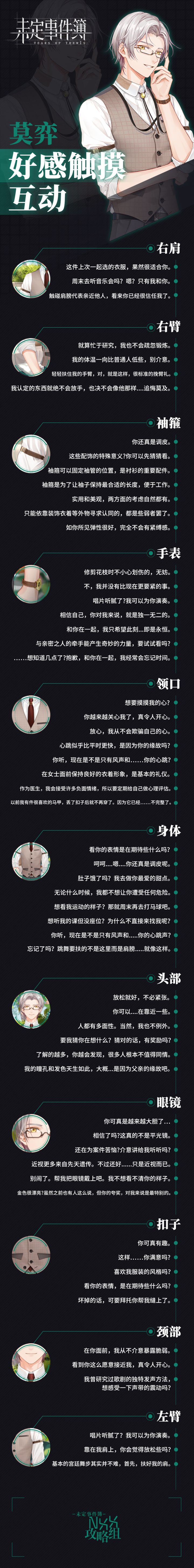 【目前正在整理25触摸互动,先放出18一睹为快】【莫弈好感触摸互动】只解锁到18级(待更新)你还真是调皮。平日里衣冠整齐的莫医生不为人知的一面你想了解吗?他的纽扣竟然……可以对莫弈上下其手的机会 莫夫人们可千万不要错过哟~想要摸摸我的心?就算忙于研究我也不会疏忽锻炼。这样…你满意吗?【左然好感触摸互动】只解锁到18级(待更新)身为左律的themis,你可曾为他的不解风情而感到