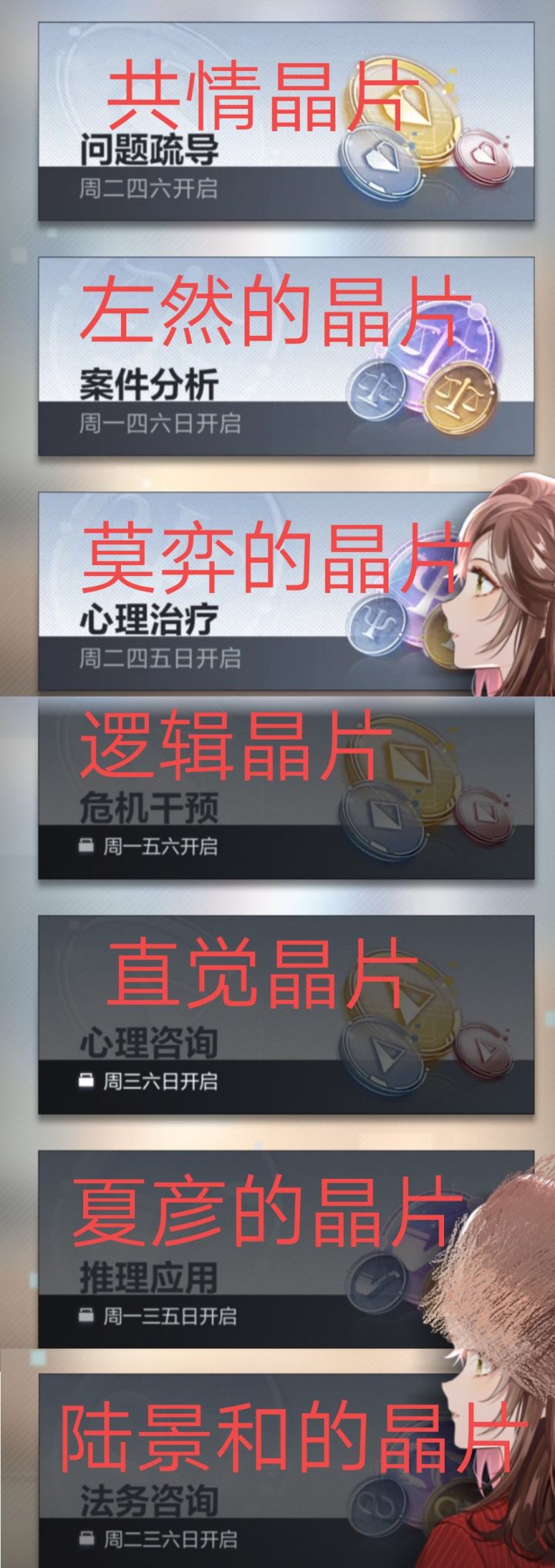 这个我老早就想做了,但是懒,一直拖就拖到现在了,估计这个都没啥人看了,而且已经有大佬发过了还比我做的全,不过做都做了就发上来看看,希望对诸位有用。关于卡牌升级材料的时间整理。星期一:夏彦的晶片、左然的晶片、逻辑晶片星期二:莫弈的晶片、陆景和的晶片、共情晶片星期三:夏彦的晶片、陆景和的晶片、直觉晶片星期四:莫弈的晶片、左然的晶片、共情晶片星期五:莫弈的晶片、夏彦的晶片、逻辑晶片星期六:左然的晶片