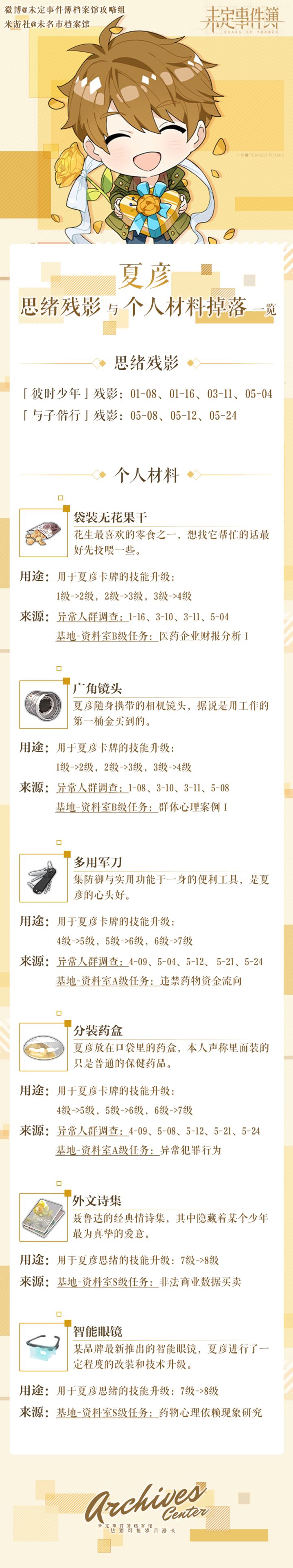 为了给律师们更好的游戏体验,小馆又为大家带来了更加全面清晰的异常关卡材料掉落一览,包含印象碎片、卡面进化晶片和技能升级素材。