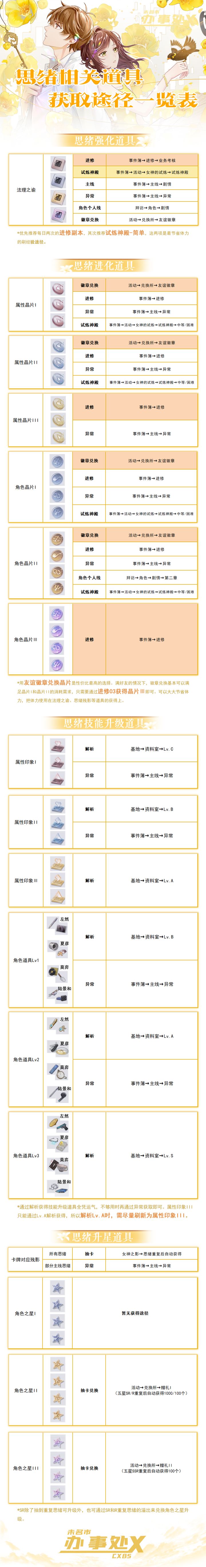 是什么,让美工老师扣图的手止不住颤抖?是什么,让整理老师好几天夜不能寐?是什么,让cxbs全体组员见者落泪——让我们一起走进史诗级大片【思绪相关道具获取途径一览表】!全新一览表已更新