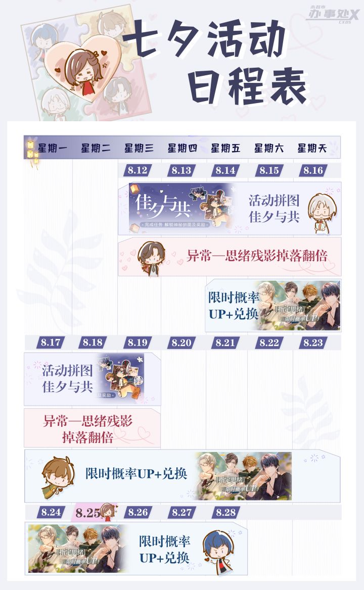 今年的七夕有点忙啊,现有拼图赶赶,又有抽卡哭哭。不要彷徨,不要悲伤,大家领好cxbs的日程表,七夕一定很难忘~