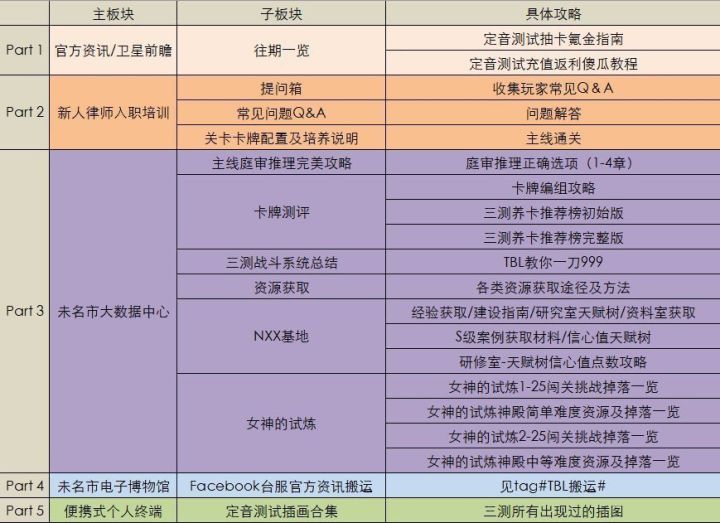 这里是未定事件簿忒不泪攻略组(TBL) Themis is Busy making Liver!(忒弥斯忙于造肝)◆非官方攻略组♦正经只是假象沙雕才是主旨&贫穷♦攻略均为组内成员为爱发电,未经允许,禁止转载。微博@未定事件簿忒不泪攻略组●今天即将公测,TBL整理汇总了定音测试(三测)的所有攻略,详细内容参考以下表格,希望对律政佳人们有所帮助PS:所有攻略均来源于三测数据,公测后我们会