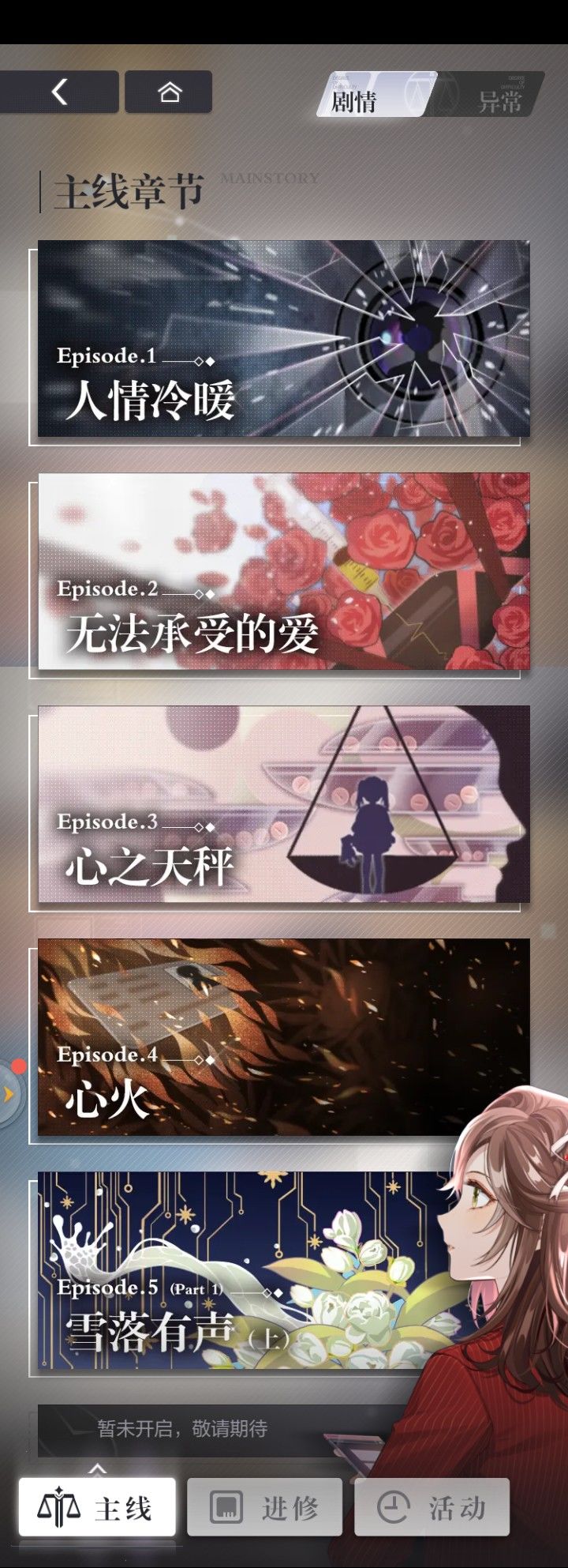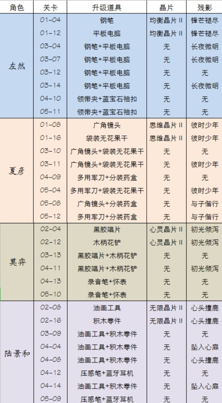 突发奇想汇总了下目前已出的异常关卡掉落(每关都有掉金币和法理之谕Ⅱ,就不仔细统计具体数目了)上图因为是想攒升思续的道具,所以是按角色整理的。还有晶片最后附上所有升思续道具的图(我有的)一级道具:二级道具:三级道具(通过资料室分析S级案例获得,我目前只有一个)———————————分界线——————————看看左然吧姐妹们,只有左律的道具有女主啊,多甜。(虽然我没有这张卡也不知