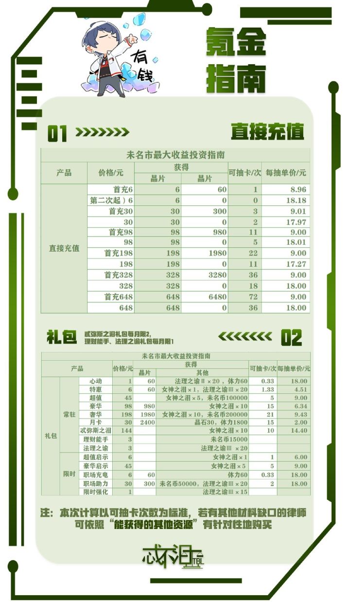 【抽卡氪金指南】来了◆从抽卡角度:长线作战的月卡最划算,平均2元/抽。◆各档位首充都接近8元/次 与原价相比打五折,是不错的选择。◆礼包中特惠新手、豪华新手与超值启示礼包首先先推荐。◆超值新手、奢华新手与豪华启示次之。●TBL在此提醒:忒弥斯之泪礼包每月限2,理财能手、法理之谕礼包每月限1。今日30号,还有2天礼包就刷新啦,心动的律师要抓紧噢。有其他材料缺口的律师们可以有针对性购入