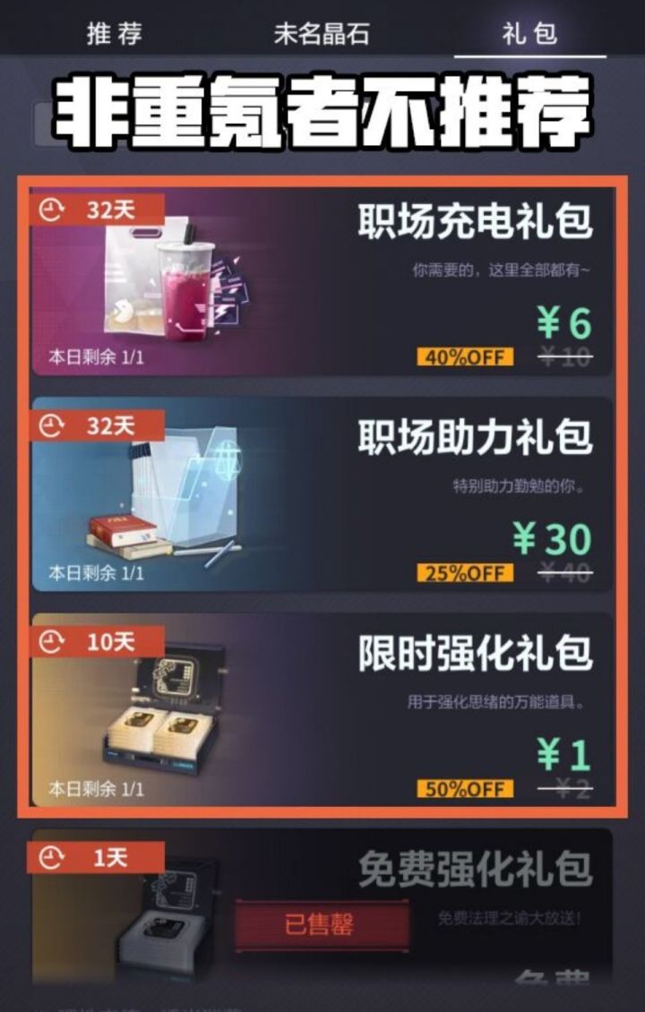 商城【礼包购买推荐】1、从长远来看,月卡的收益是最高的。2、只可单次购买的常驻礼包(心动、特惠、超值、豪华、奢华),性价比很高,但不一定要马上购买。3、只可单次购买的限时礼包(超值启示、豪华启示),性价比很高,14天内购买即可。4、月预算超过300人民币的玩家,这两天可优先考虑购买忒弥斯之泪礼包,因为它是按月刷新,而现在已经是月底了,8.1就会刷新。5、非重氪玩家不推荐职场充电礼包和职场
