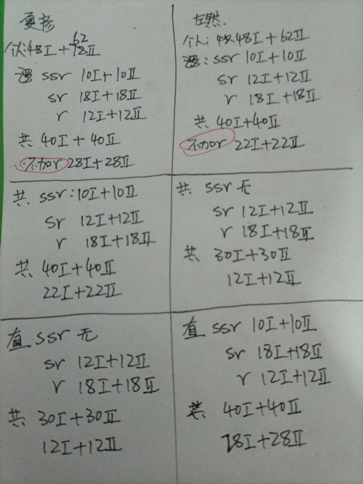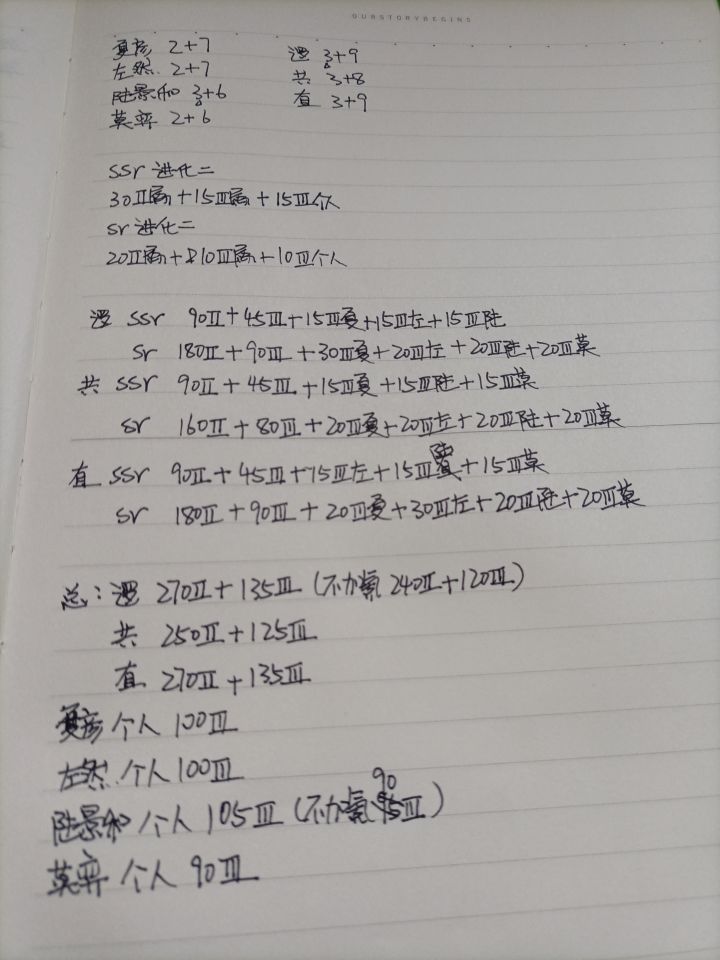 昨天刚刚整理完进化一 没想到今天要开始进化二了由于r卡是只能进化一次的 所以只需要统计ssr和sr的进化材料就可以了这真是一个浩大的工程(默默看了看自己的体力药水)话不多说直接上图(请原谅我丑陋的字)图中的不加氪指的是氪金5k才能得的小陆总ssr绘恋春风(逻辑)