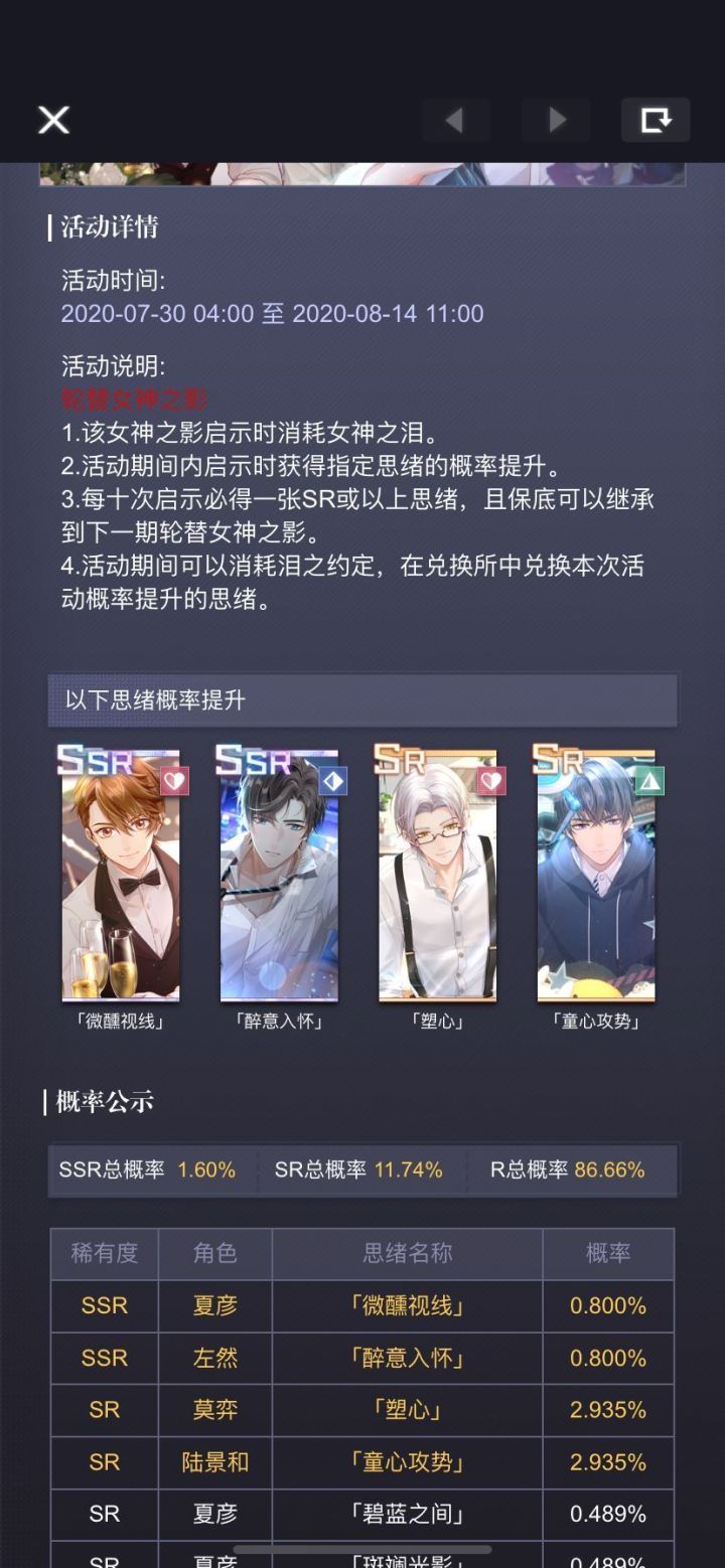 【注意】 概率up和前30抽ssr是两个卡池。up池SSR概率1.60%,30抽SSR概率2.0%。 而且30抽ssr是必中的。 如果不到30就抽中了ssr就不再有保底, 后续保底均为188。 律师们看清楚卡池