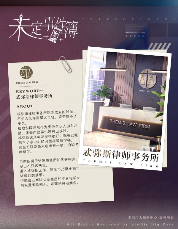 KEYWORD - 忒弥斯律师事务所THEMIS LAW FIRM从刚成立时备受质疑,到如今驰名全市,忒弥斯律师事务所的成就与左然律师密不可分。▌★联系我们官方微博:微信公众号:未定事件簿同时欢迎大家加入官方QQ群一起调戏开发组:未定事件簿官方4群:694090933未定事件簿官方5群:661879466